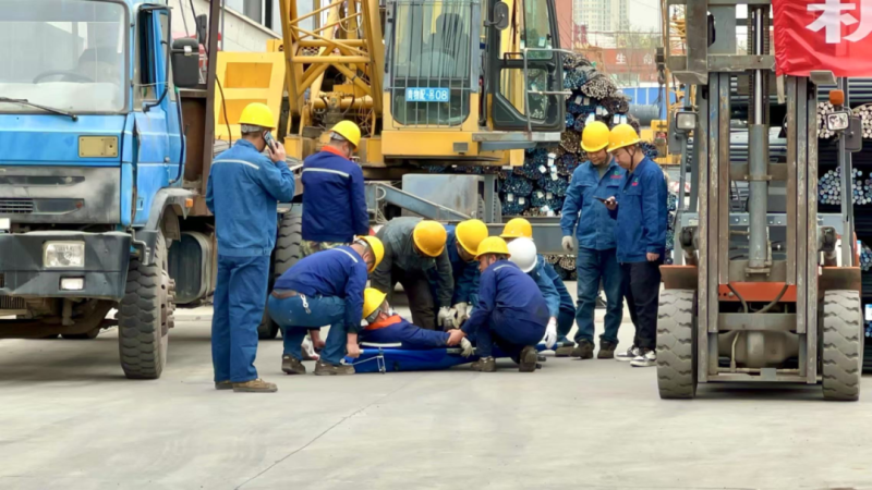 本次演練模擬鋼板區在進行吊裝作業時突發輪胎起重機吊裝貨物擺幅過大傷人事故。演練前期,制定了詳細方案并組織培訓,籌備救援、醫療等物資,布置模擬場景。演練啟動后,通訊聯絡組迅速傳遞事故信息,現場指揮組即刻啟動應急響應。警戒疏散組快速隔離現場、疏散人員;應急救援組解救受傷人員、排除設備故障;醫療救護組對傷員緊急救治并送醫;后勤保障組及時供應物資,各環節有序推進。